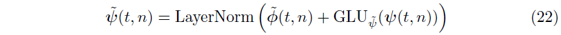 전과 마찬가지로 $는 모든 layer에 공유된다. 여기에 gated residual connection을 적용시키고 sequence-to-sequence layer의 결과값을 더해서 LayerNorm을 적용시키면 다음의 식을 얻을 수 있다.