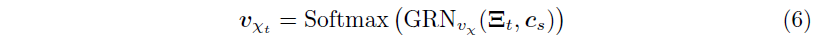 $\xi_t^{(j)} \in \mathbb{R}^{d_{model}}$이 time $t$에서 $j$번째 variable의 transformed input이라 하고, $\Xi_t=\Big[ \xi_t^{(1)^T}, \cdots, \xi_t^{(m_\chi)^T} \Big]^T$를 time $t$의 모든 past input을 flatten한 벡터라 하자. 이때 variable selection weight는 $\Xi_t$와 external context vector $\mathbf{c}_s$를 GRN과 softmax layer를 거쳐 나온 값으로, 다음과 같이 구해진다.
