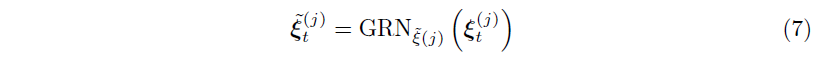 이렇게 얻어진 $\mathbf{v}_{\chi_t} \in \mathbb{R}^{m_\chi}$는 variable selection weight를 나타내는 벡터이고, $\mathbf{c}_s$는 static covariate encoder를 통해 얻을 수 있다. static variable에 대해서는 context vector $\mathbf{c}_s$가 생략된다. 또한, 각 time step에서 $\xi_t^{(j)}$에는 다음과 같이 GRN이 적용된다.